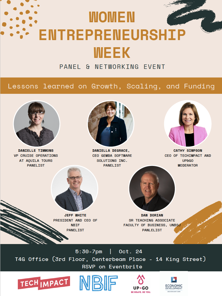 Cathy Simpson, TechImpact CEO, will serve as the event’s moderator. Panelists will share their personal experiences as entrepreneurs with a particular emphasis on growth, scaling and funding. We have great sponsors in NBIF, Economic Development Greater Saint John and UP+GO.