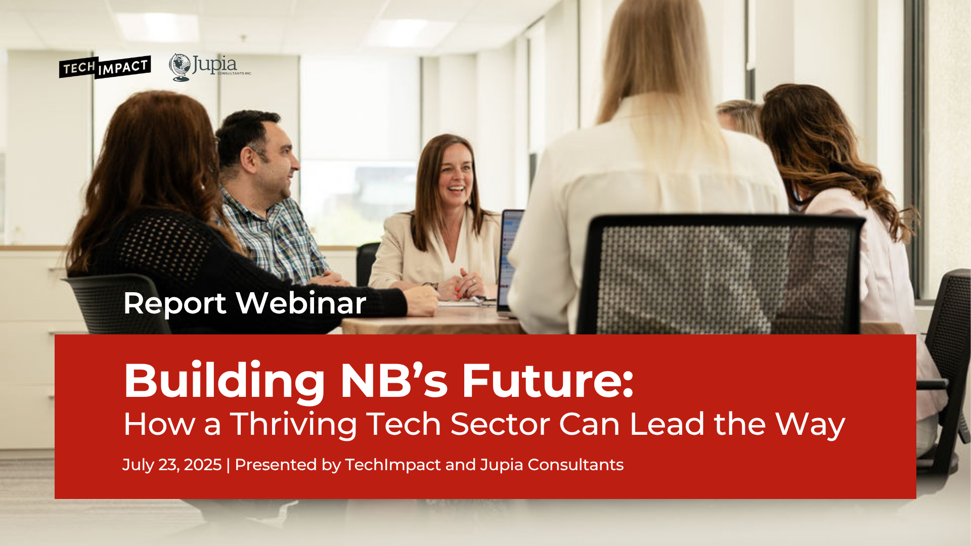 On July 23, TechImpact CEO Cathy Simpson and economist David Campbell of Jupia Consultants hosted a live virtual conversation on the future of New Brunswick’s tech sector. The session presented findings from TechImpact and Jupia’s report, Building NB’s Future: How a Thriving Tech Sector Can Lead the Way, focusing on past economic patterns in New Brunswick’s IT sector and workforce, and outlining practical opportunities and recommendations to support the province’s tech growth.